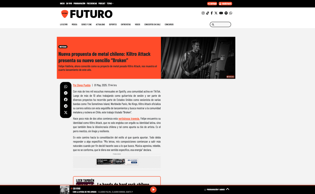 Hablamos del artista Felipe Valdivia, ahora conocido como su proyecto de metal pesado Kiltro Attack, nos muestra el cuarto lanzamiento de este año acompañado de una fiel comunidad que lo sigue y los espera cada mes.